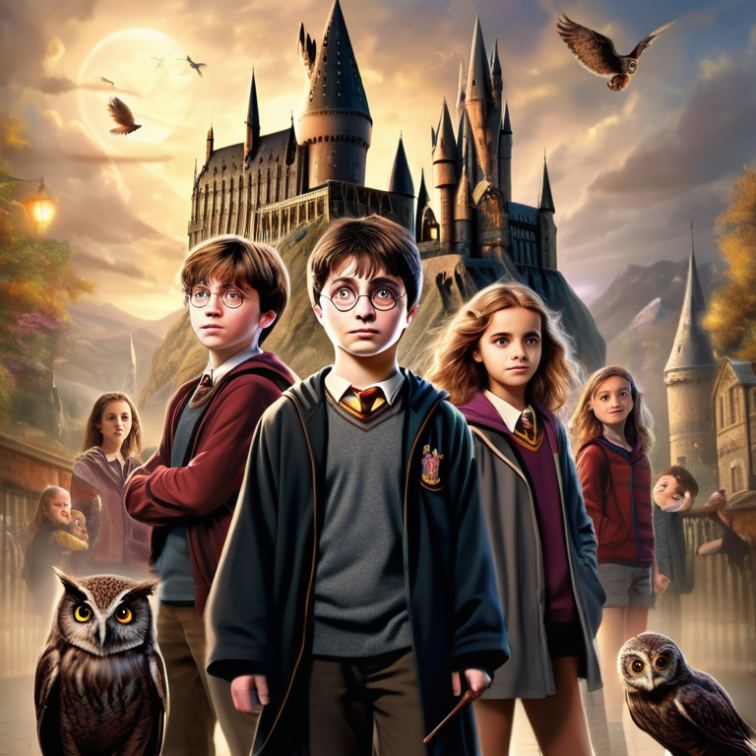 Гарри — сирота, который в одиннадцать лет узнаёт, что он волшебник, и поступает в школу чародейства и волшебства Хогвартс. Там он находит верных друзей — Рона и Гермиону, сталкивается с опасностями и противостоит тёмному волшебнику Волдеморту. История Гарри Потера сочетает в себе элементы фэнтези, приключений и взросления, затрагивая темы дружбы, смелости и борьбы со злом.