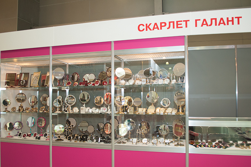 У нашей компании на этой выставке получился весьма привлекательный стенд. В этом году мы впервые представили яркую, потрясающе красивую подарочную линейку товаров бренда Weisen: настольные и компактные зеркала, подарочные бритвенные наборы, подарочные наборы расчесок, подарочные портсигары. Большинство этой продукции было оформлено оригинальными стразами Сваровски, из-за чего наш стенд блестел и сверкал, как новогодняя ёлка.