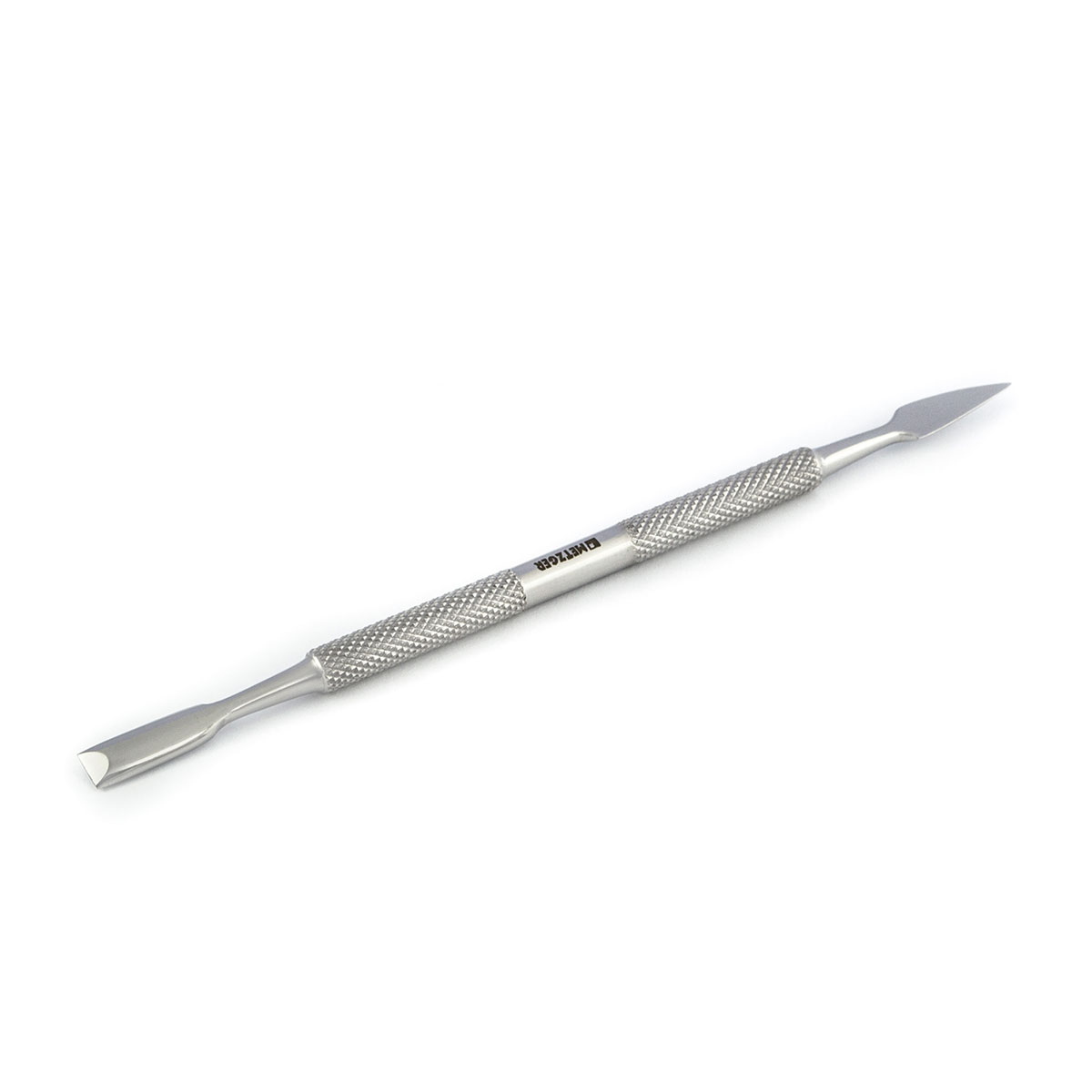 Шабер двухсторонний. Имеет две рабочие поверхности - прямоугольную лопатку для отодвигания чувствительной кутикулы и пику, обеспечивающую тщательную очистку ногтевого плато под любым углом.